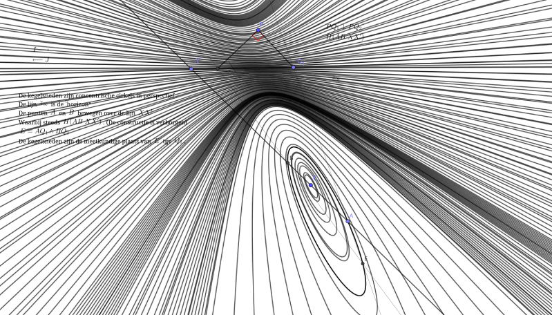 Het punt $Q_1$ laten we (in gedachten lopen over de lijn $z_\infty$ en punt $Q_2$ loopt daarachter aan zodat steeds $PQ_1\perp PQ_2$.